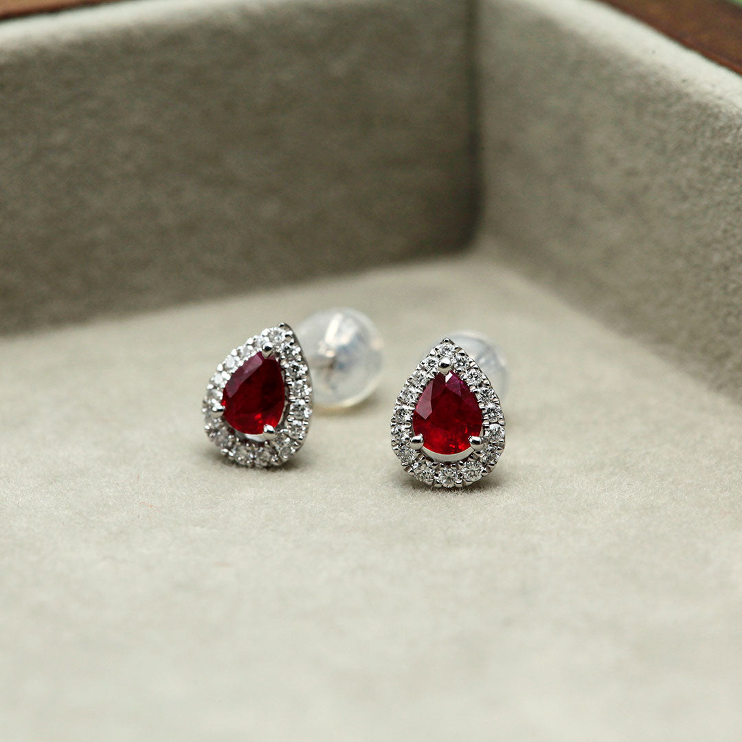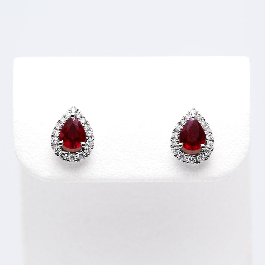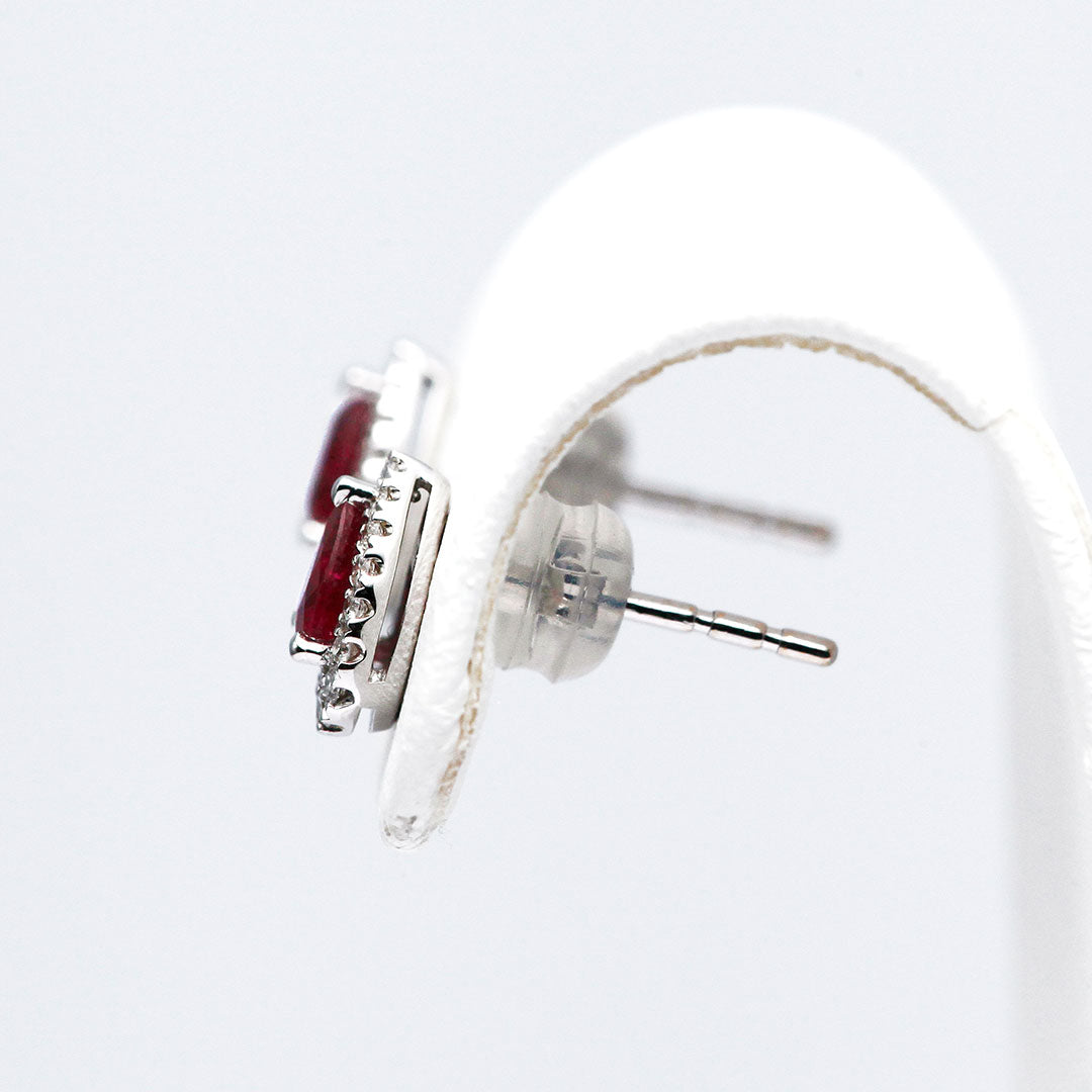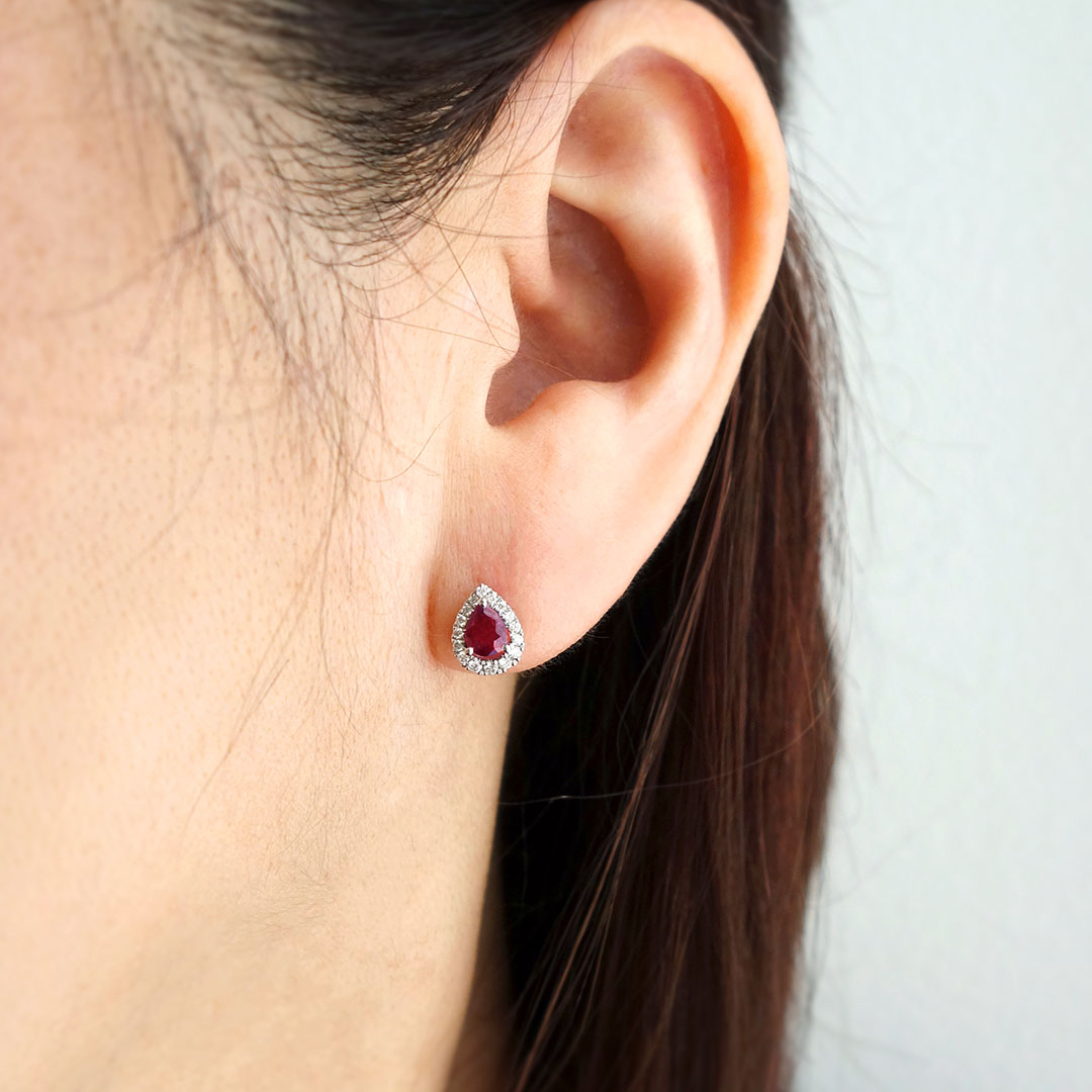 ドロップ状のダイヤモンドヘイローデザインのセンターには濃くて上質なルビー。使いやすいデザインで普段使いにピッタリなホワイトゴールド製のルビーピアス。