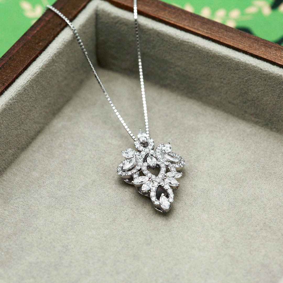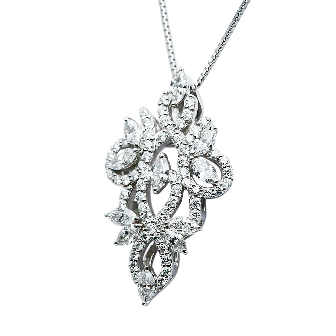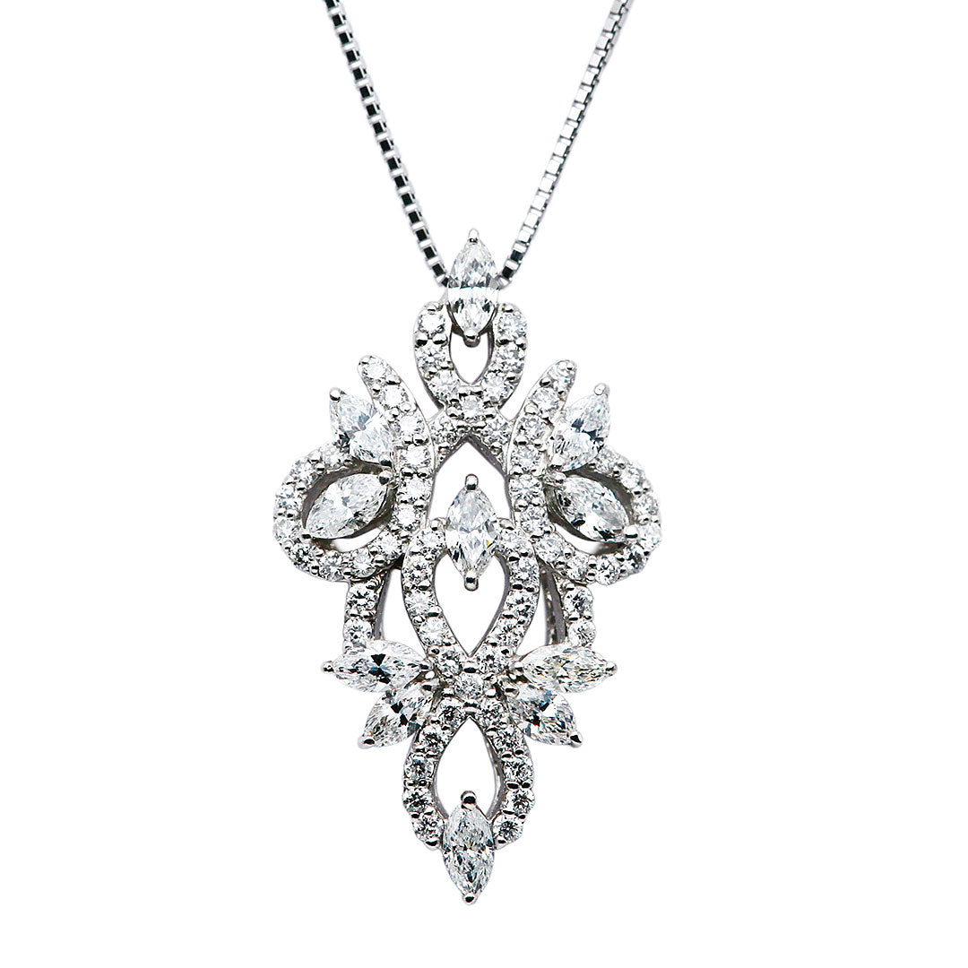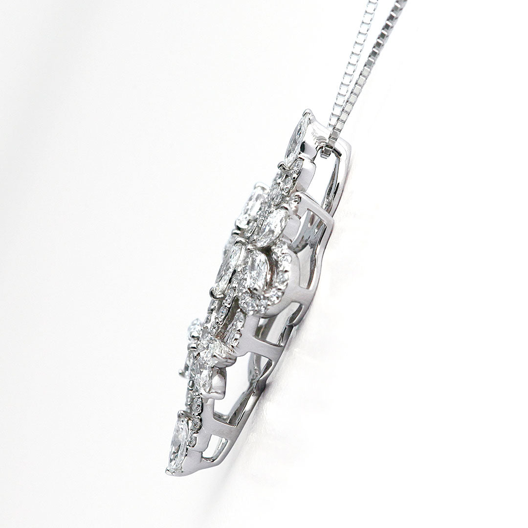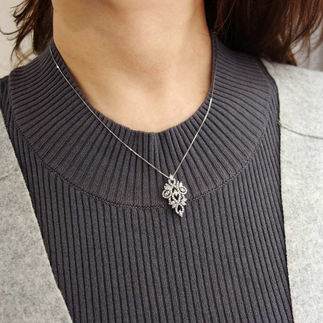 プラチナ製のダイヤモンドペンダントネックレス。ラウンドカットとマーキスカットのダイヤモンドを贅沢にあしらい、TOTAL1.2ctのゴージャスな輝きが首元を彩ります。シャープなデザインでデコルテをすっきり引き締め、動くたびにキラキラと存在感を放つ一品。コーディネートの主役になる華やかなネックレスです。