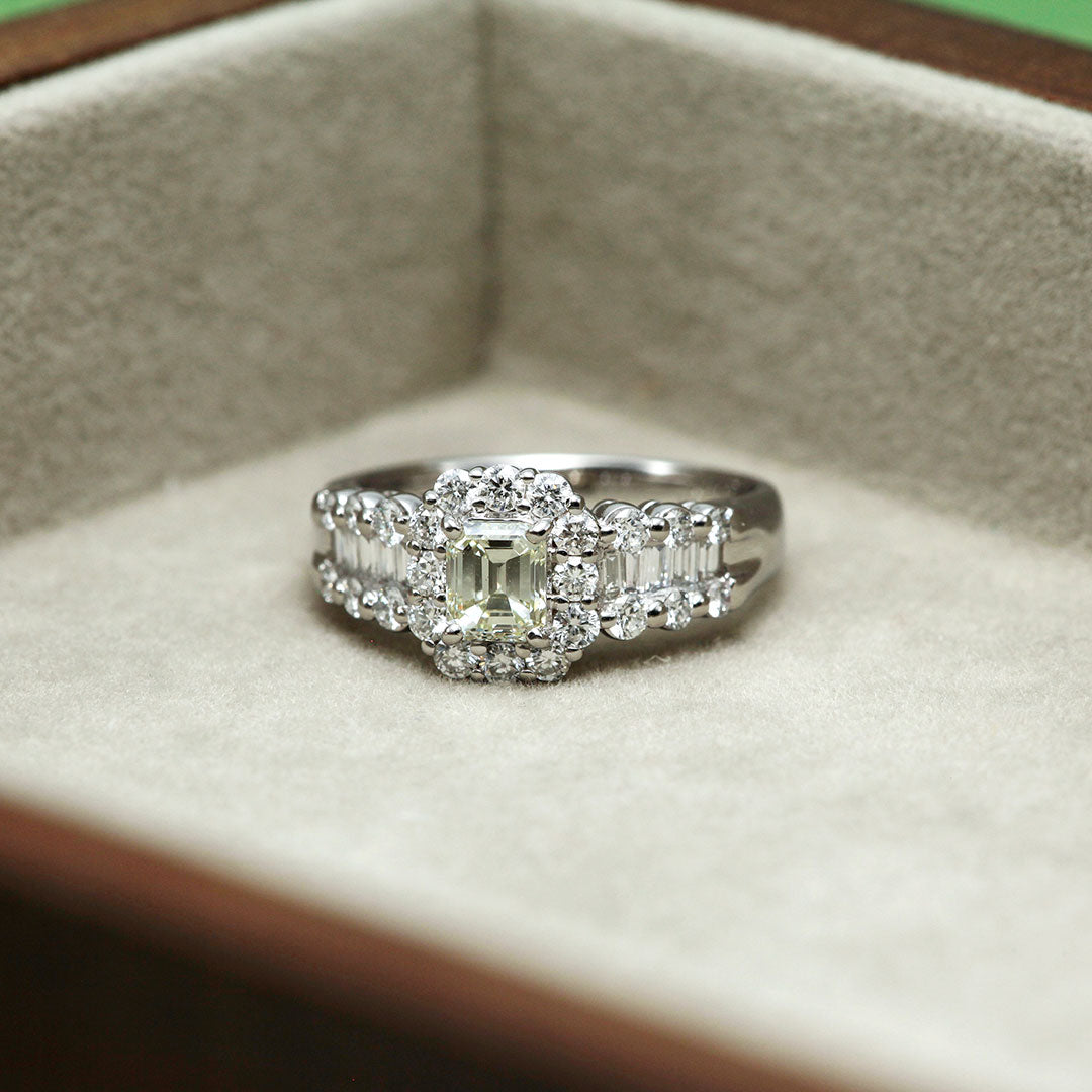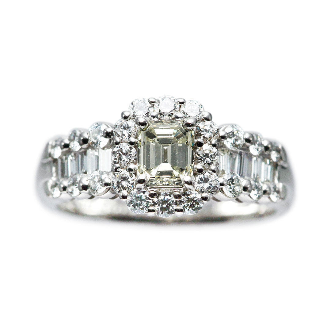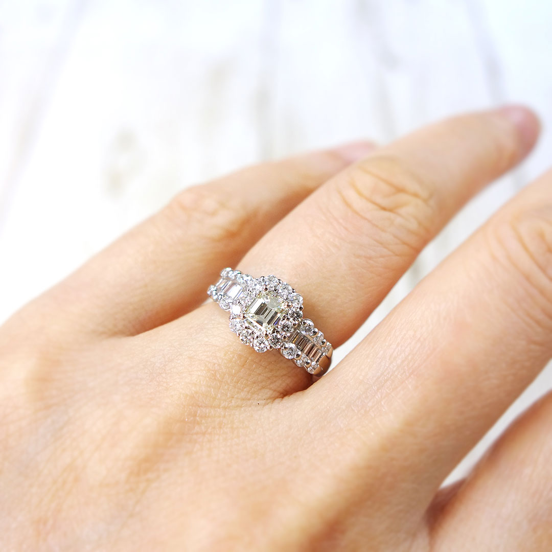 0.905ctの大粒エメラルドカットダイヤモンドを2重に取り巻いて華やかなデザインに。クラシカルな印象に仕立てたプラチナ製ダイヤモンドリング。