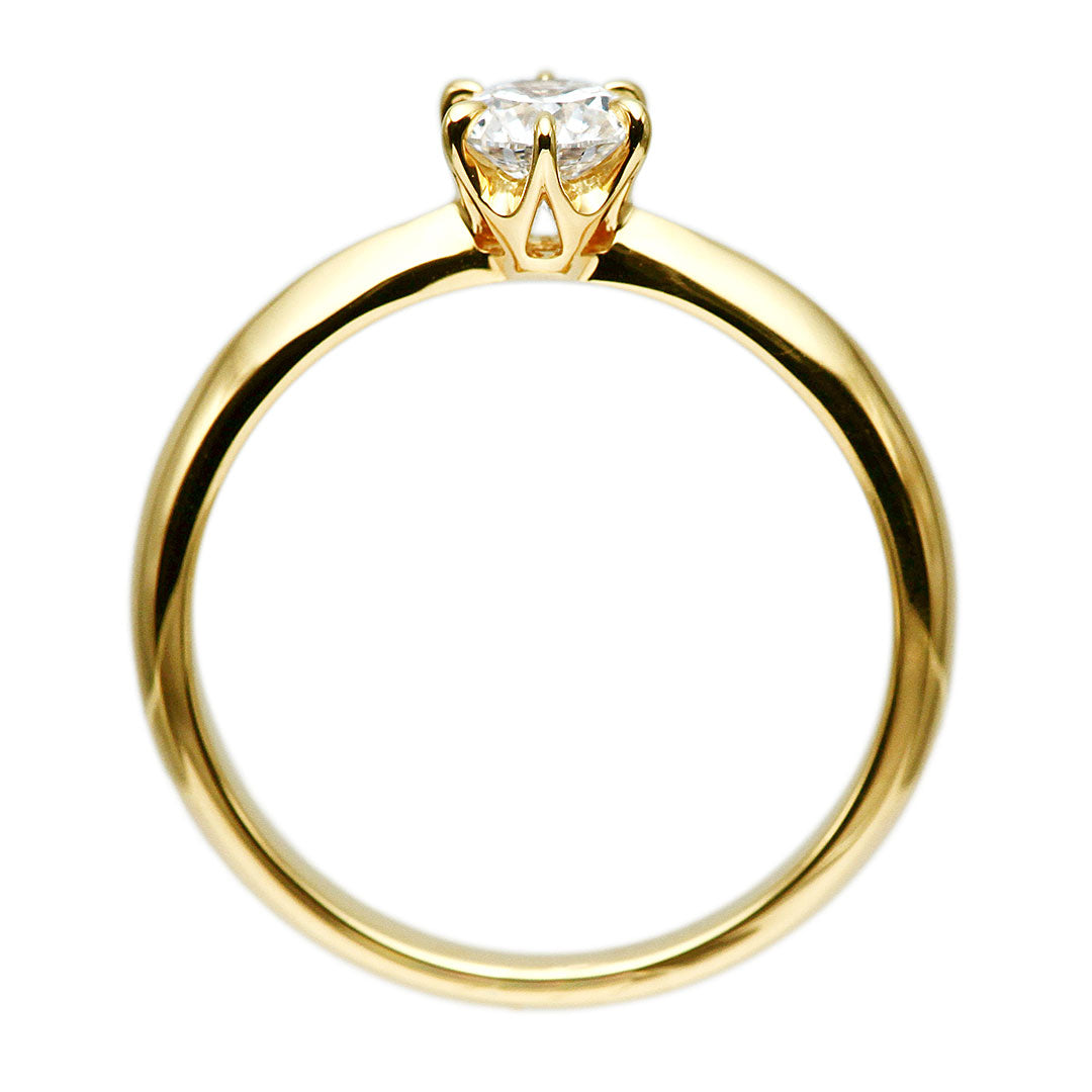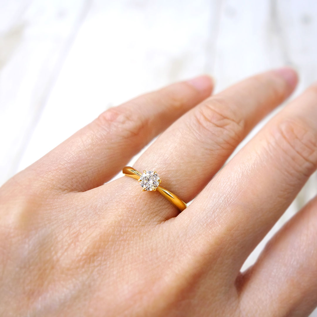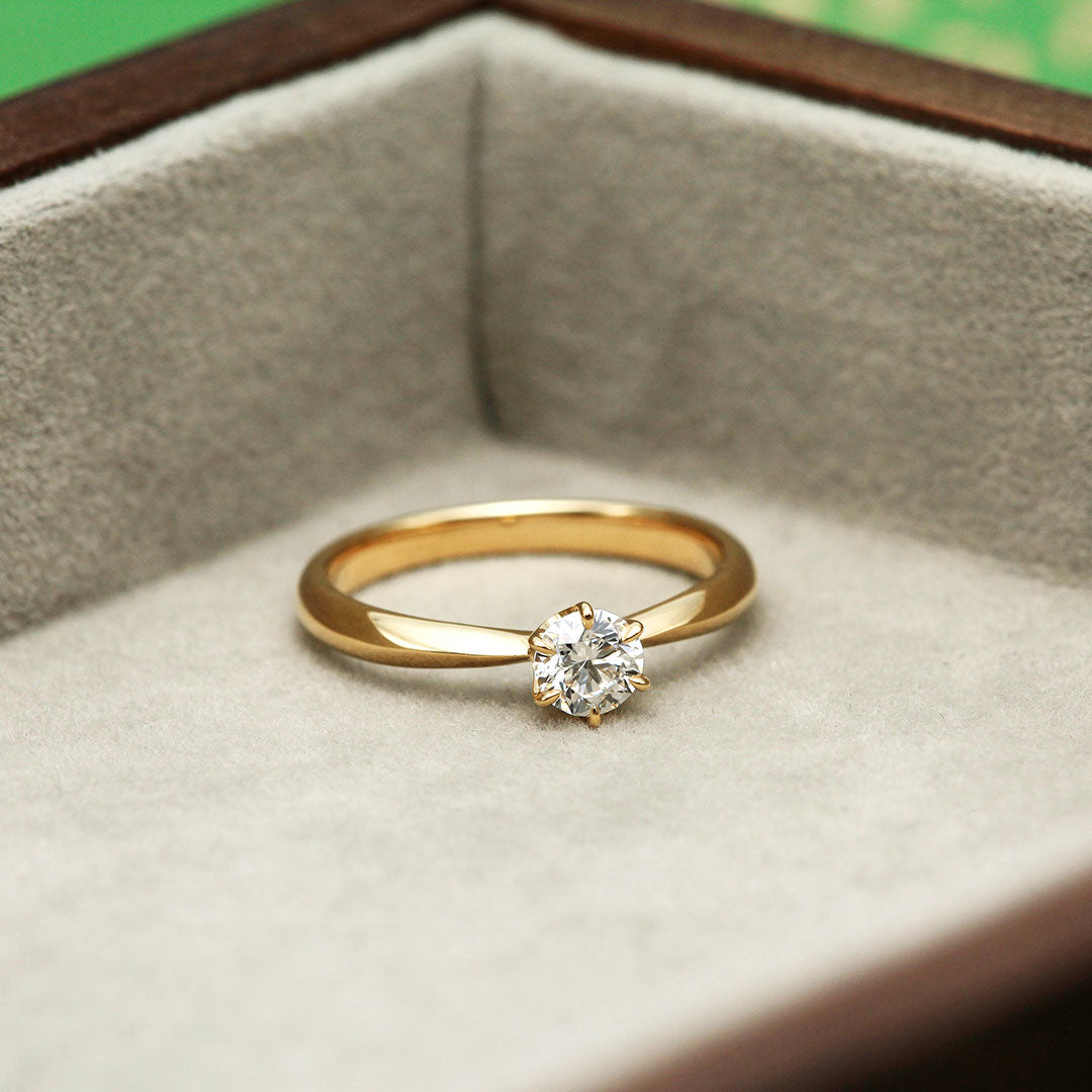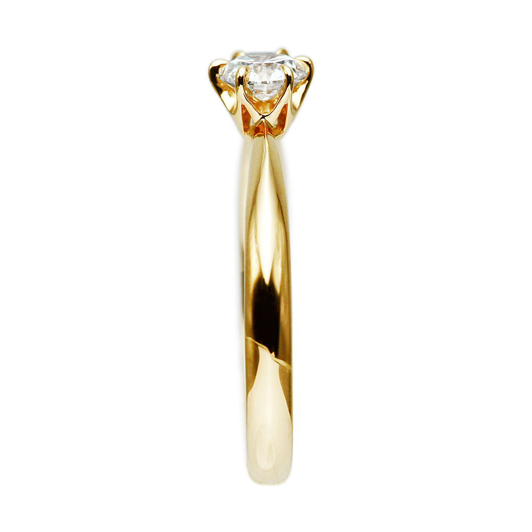 KK18イエローゴールド製のダイヤモンドリング。センターには、無色で透明感が高く、輝きの美しい高品質な0.4ctダイヤモンドをセットしました。装飾を抑えたシンプルなソリティアタイプは、ダイヤモンドそのものの存在感を最大限に引き立て、指元を上品に彩ります。時代や流行に左右されない王道デザインで、婚約指輪としてはもちろん、記念日の贈り物や一生物のジュエリーとしてもおすすめできる一本です。