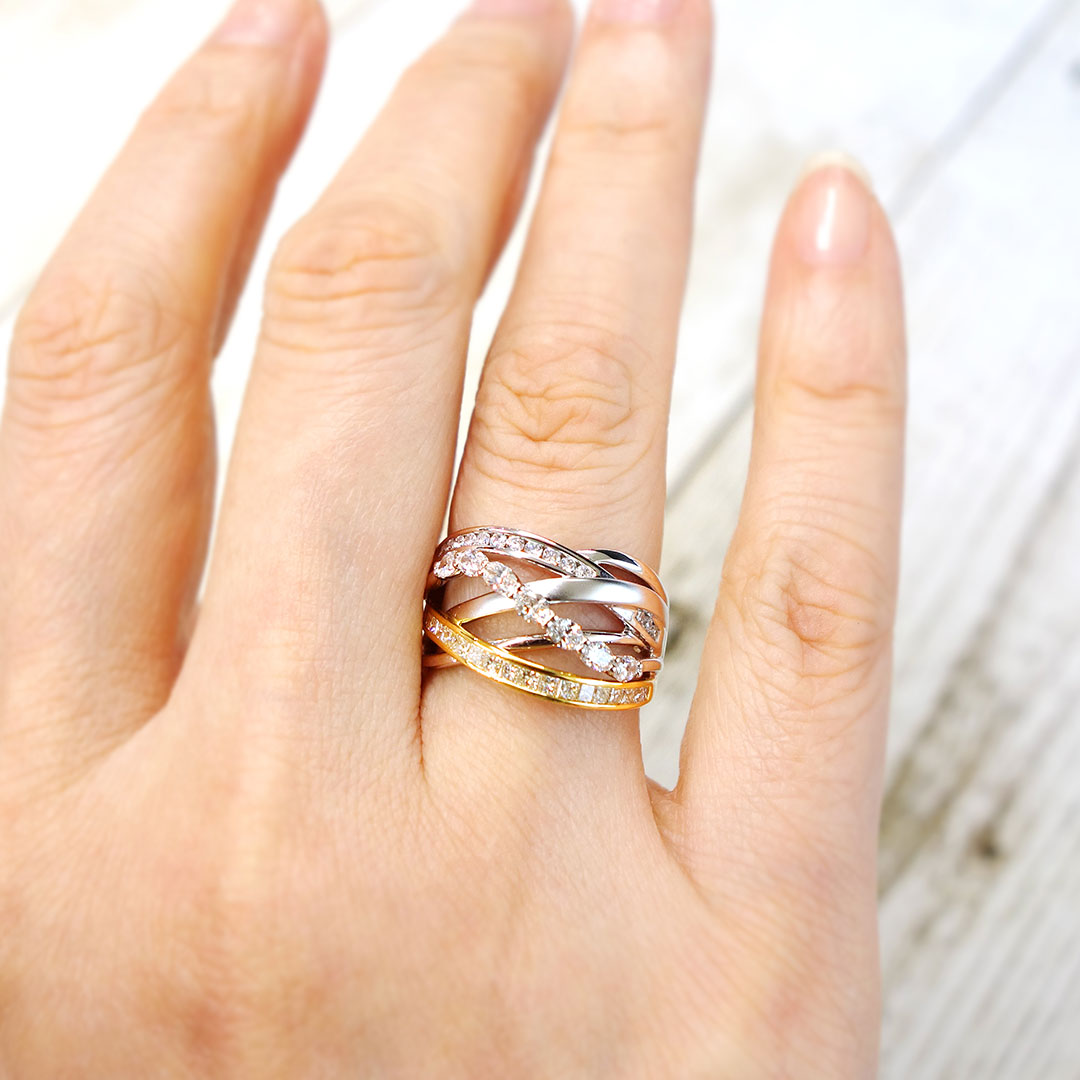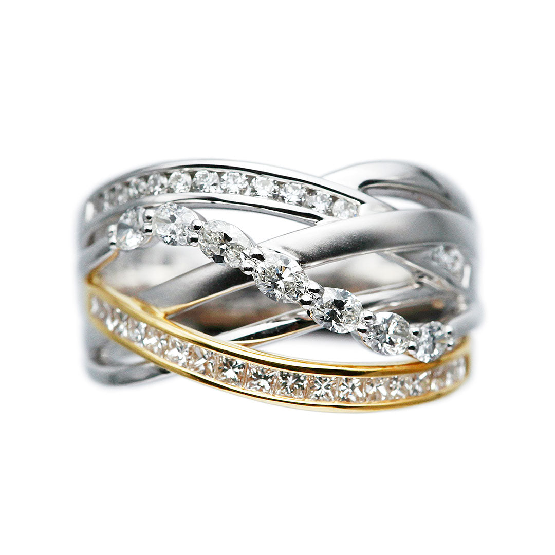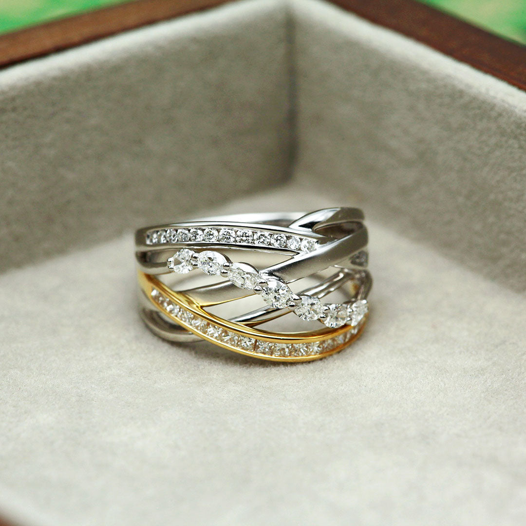 プラチナ950とK18イエローゴールド製のダイヤモンドリング。プラチナとゴールドのコンビにダイヤモンドをあしらい、華やかさをプラス。ボリューム感のあるデザインで、薬指はもちろん中指や人差し指にも映えるリングです。