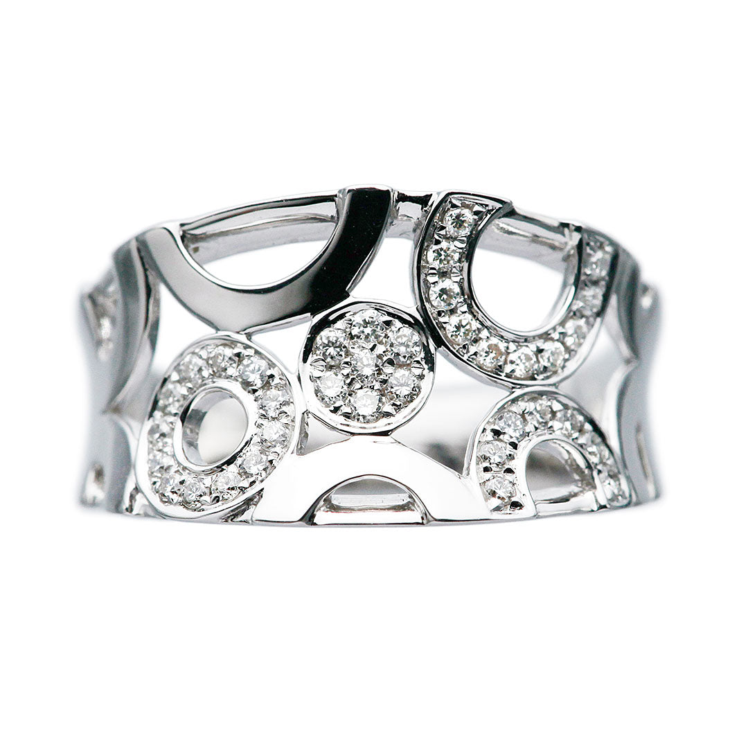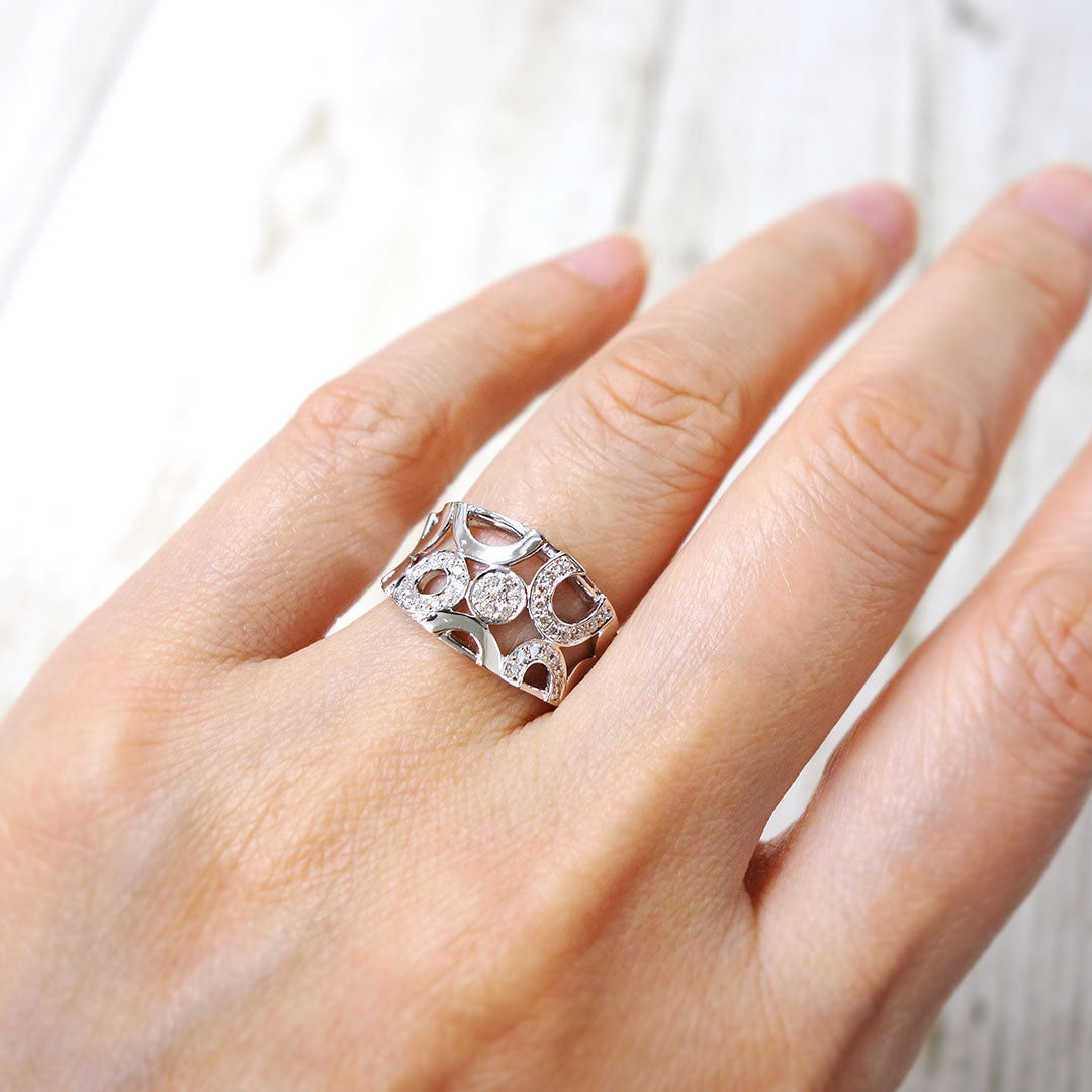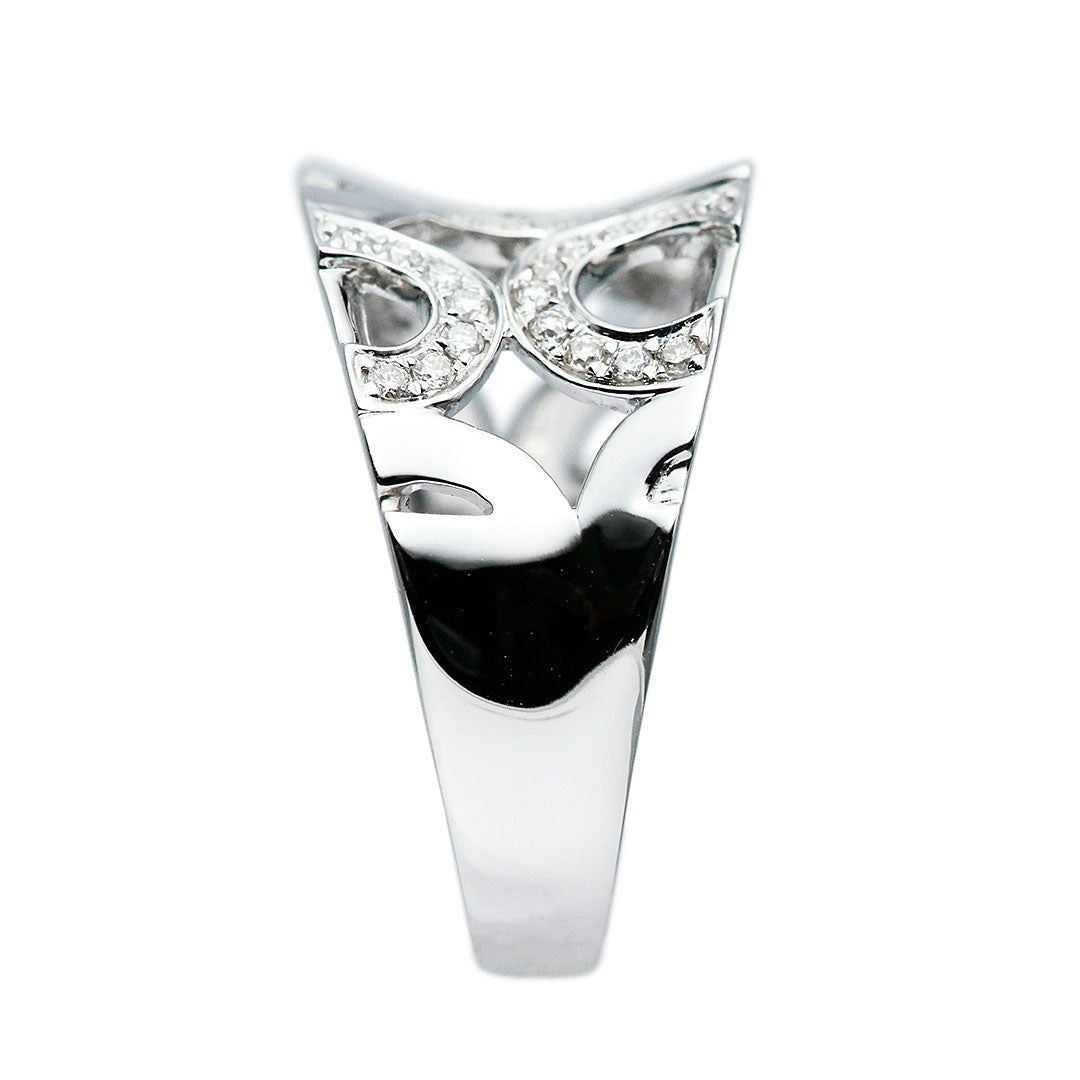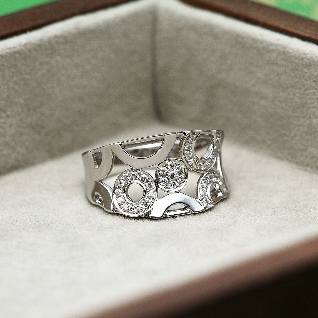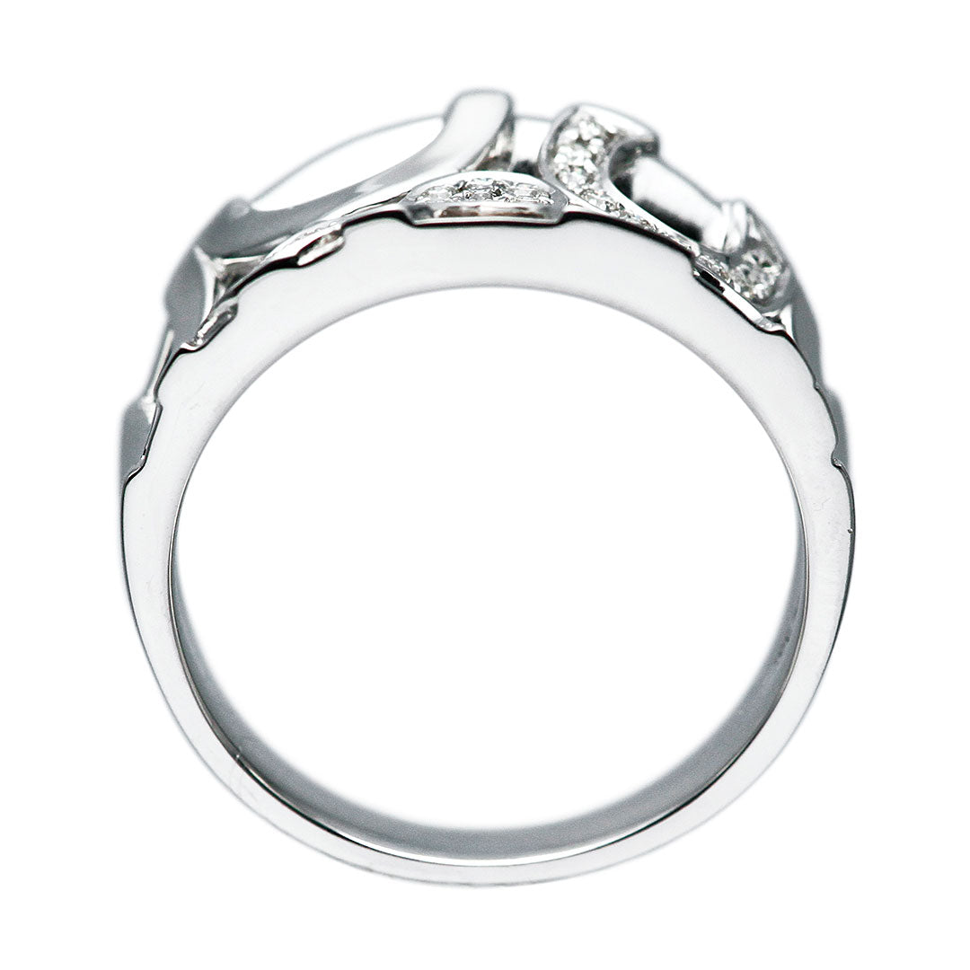 K18ホワイトゴールド製のダイヤモンドリング。抜け感のある個性的なデザインに、ダイヤモンドのアクセントを効かせたおしゃれな一品です。中指や人差し指に着けても映え、コーディネートの主役になるリングです。
