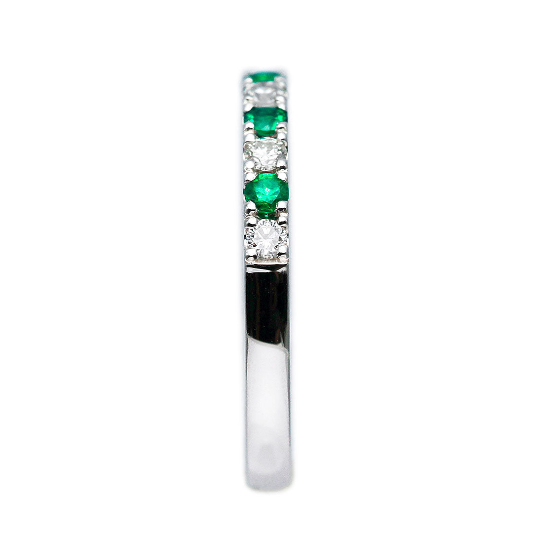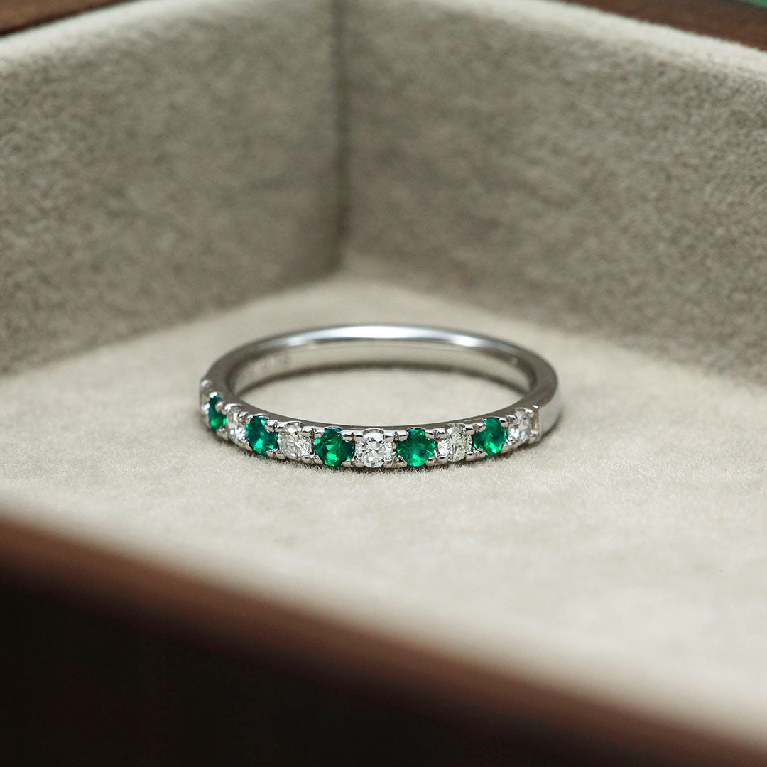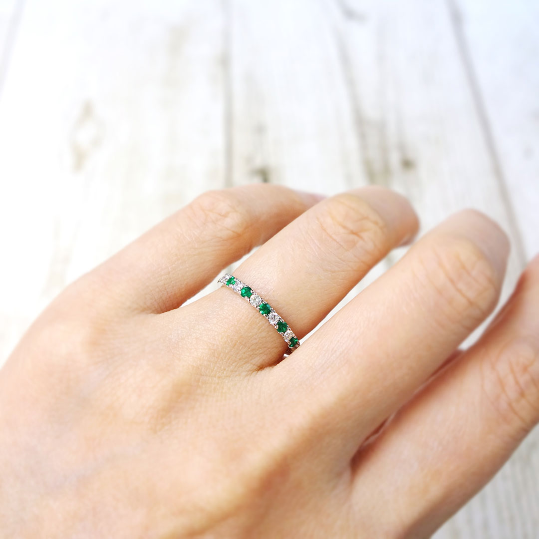 プラチナ製のエメラルド&ダイヤモンドエタニティリング。鮮やかな緑色の5月の誕生石エメラルドをアクセントにあしらい、指元を華やかに彩ります。シンプルで飽きのこないデザインで、1本使いはもちろん、細めのリングとの重ね付けも楽しめるリングです。