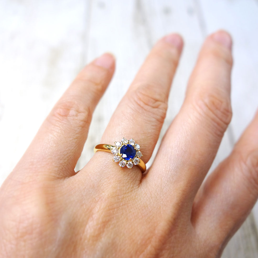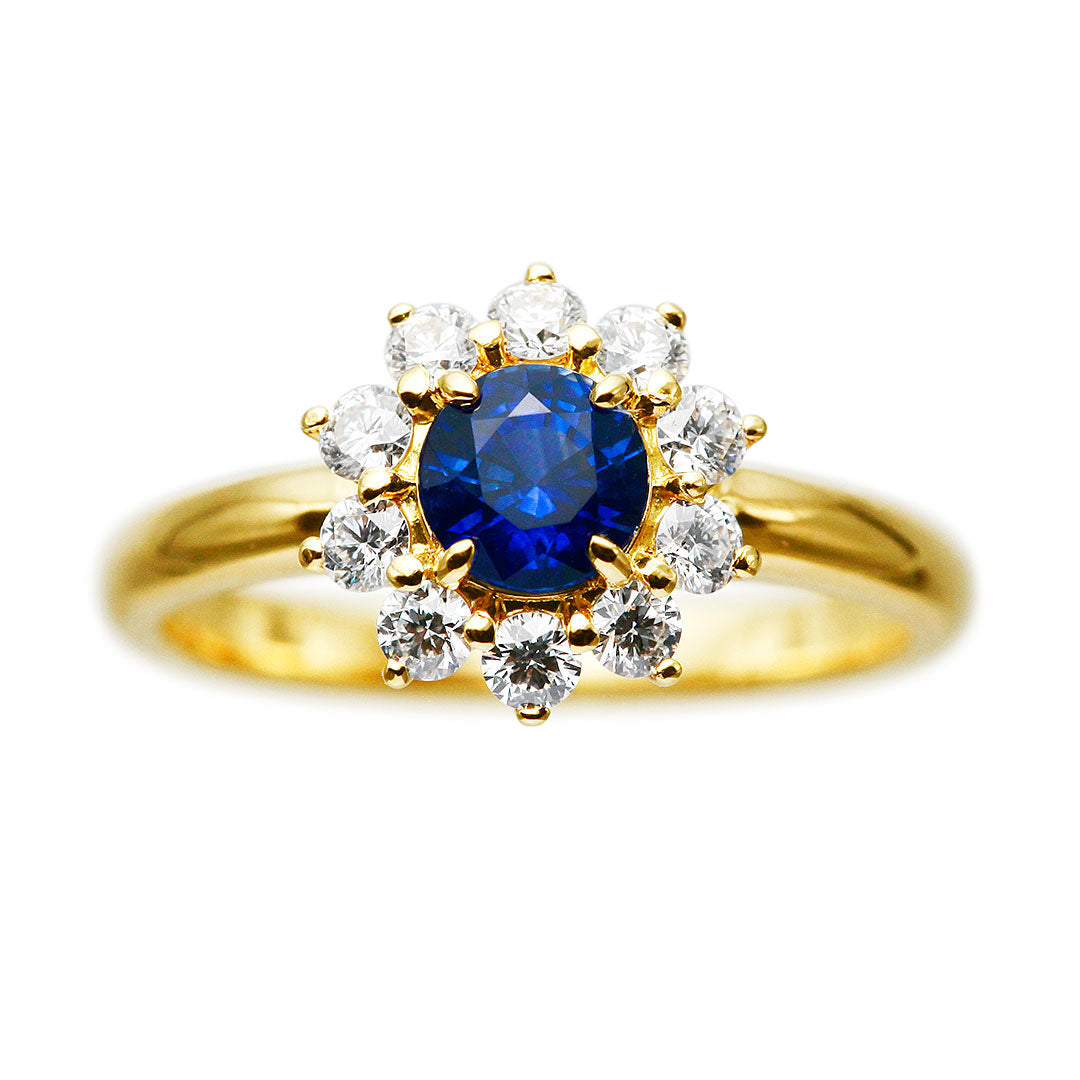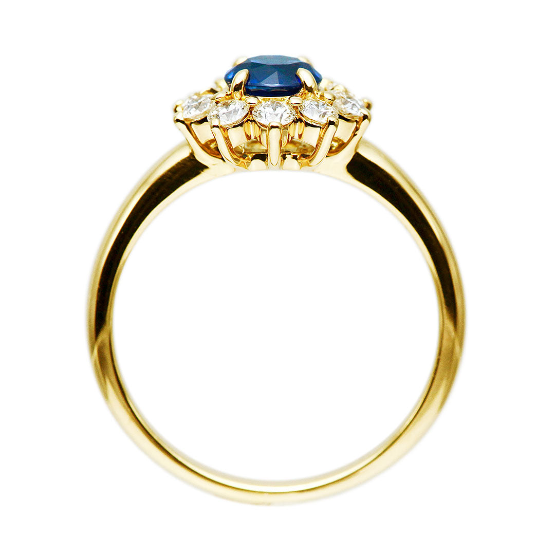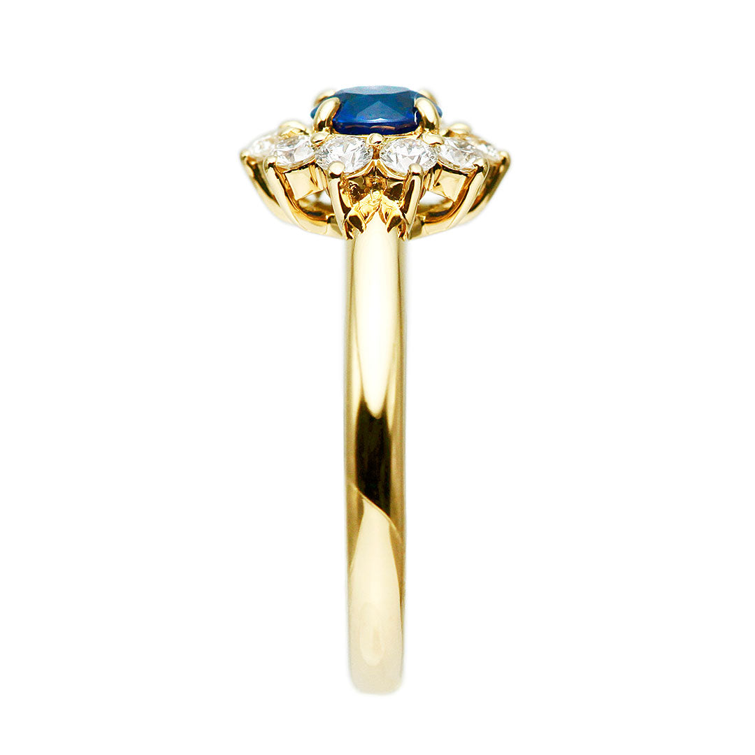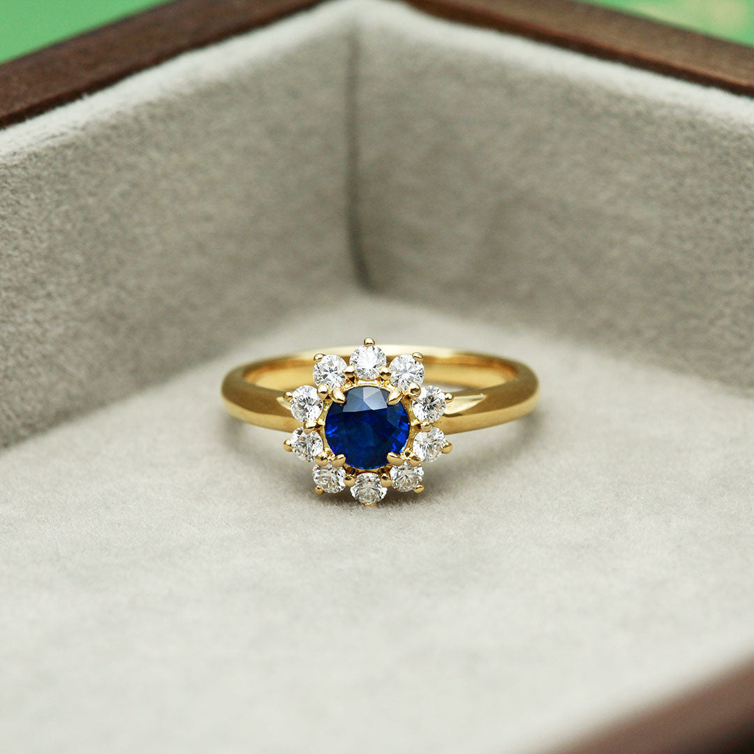 K18イエローゴールド製のサファイアリング。センターには、最高品質のロイヤルブルーサファイアを贅沢にセットしています。深く濃い気品あるブルーを、周囲にあしらったダイヤモンドのヘイローデザインが引き立て、イエローゴールドの華やかさと相まって手元を明るく印象的に演出。流行に左右されない王道デザインで、サファイア本来の美しさを長く楽しめる、飽きの来ない一品です。