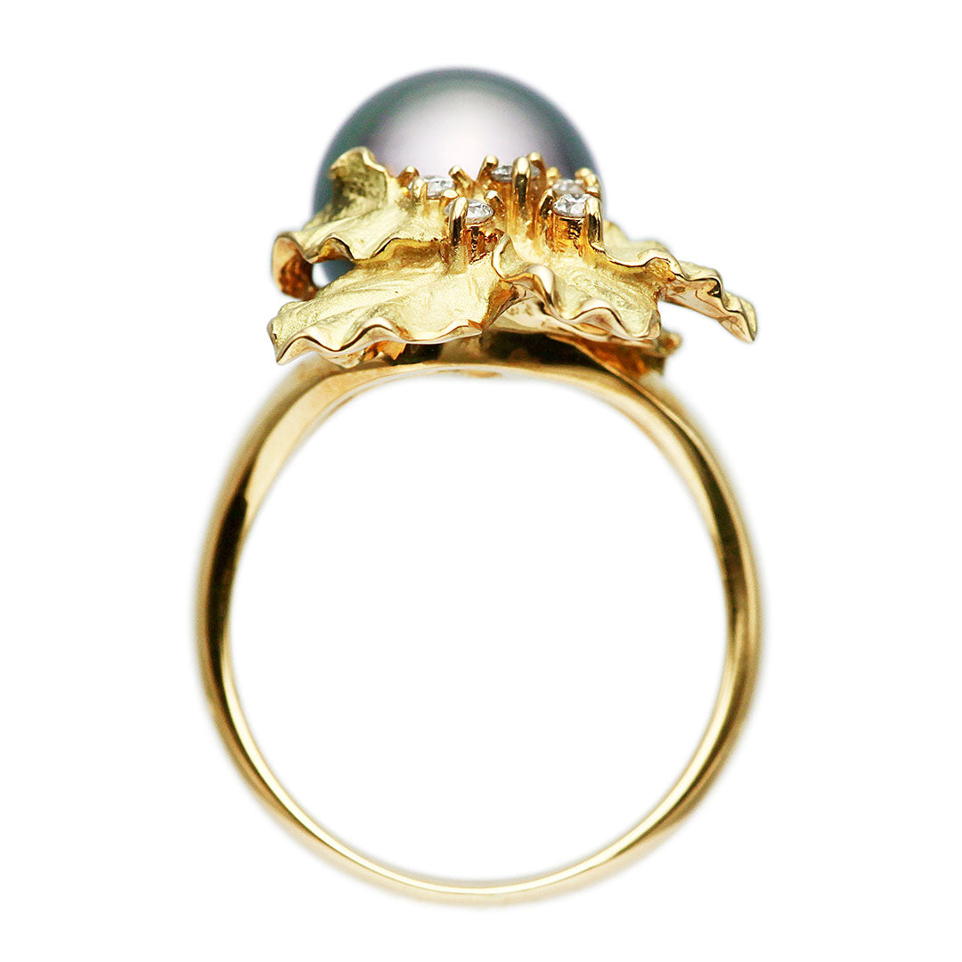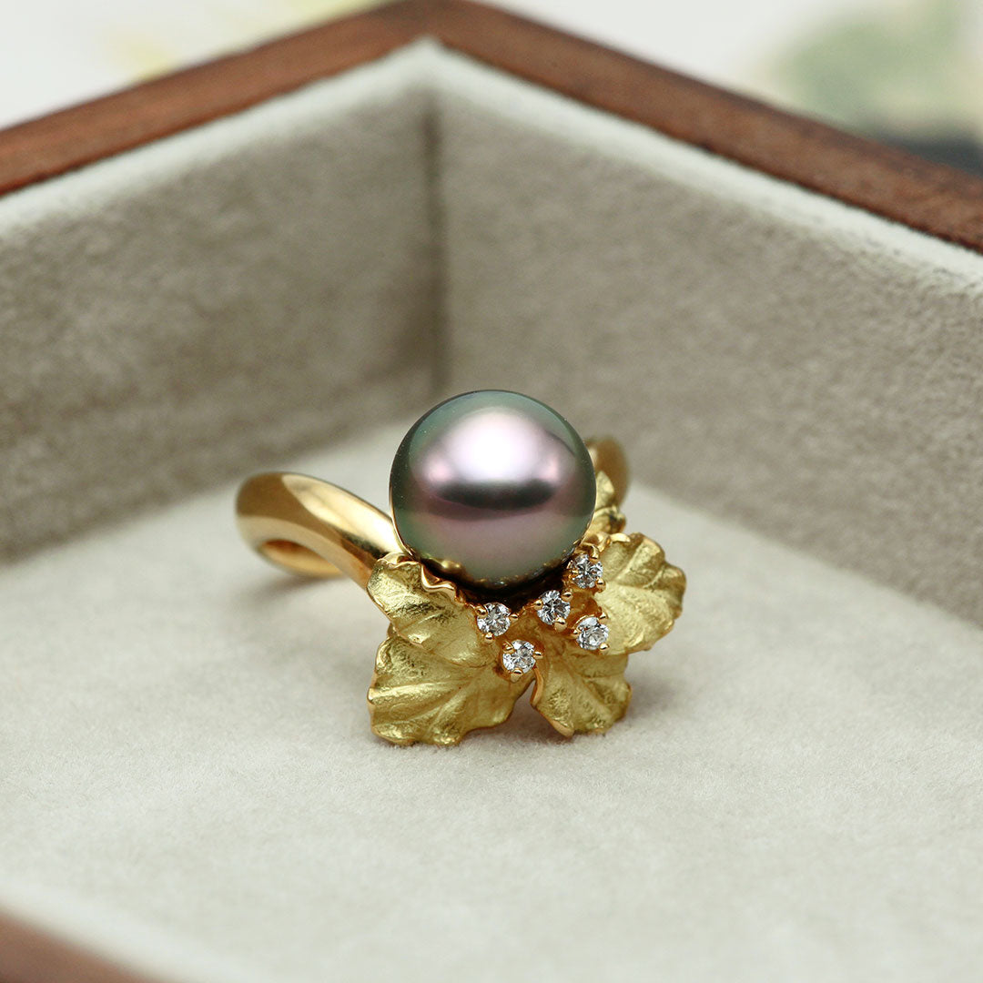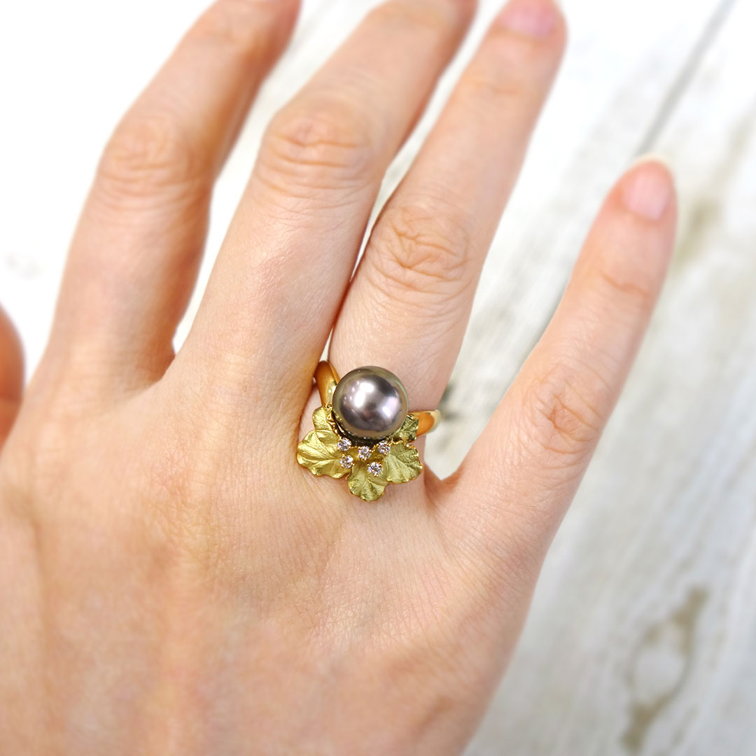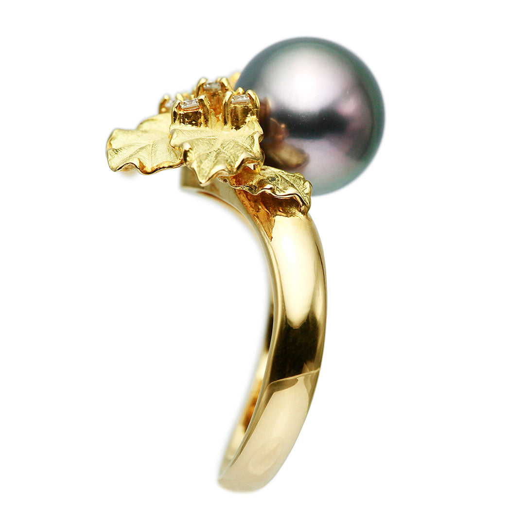 ゴールドの葉が瑞々しい。南洋黒蝶真珠リング 。
