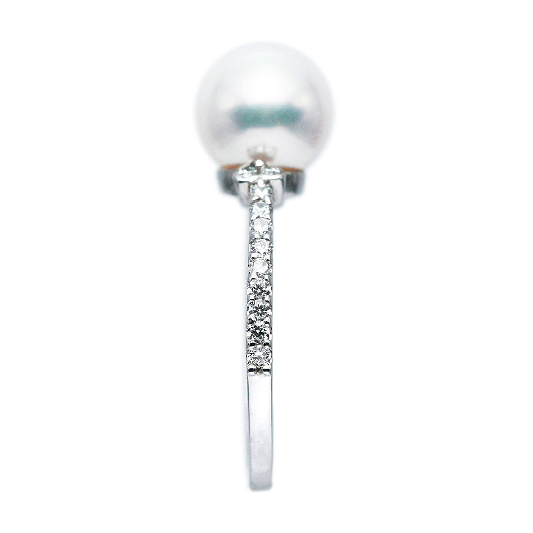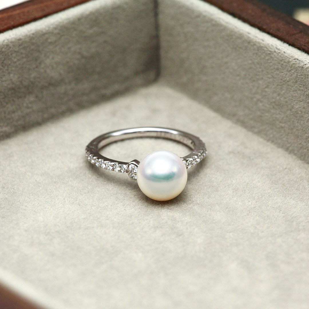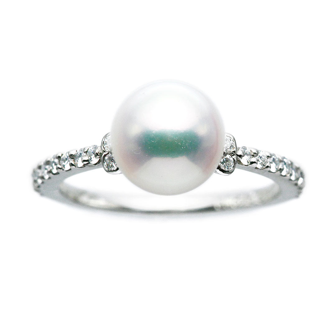 ほっそりエタニティに両脇のダブルメレが可愛いあこや真珠リング。