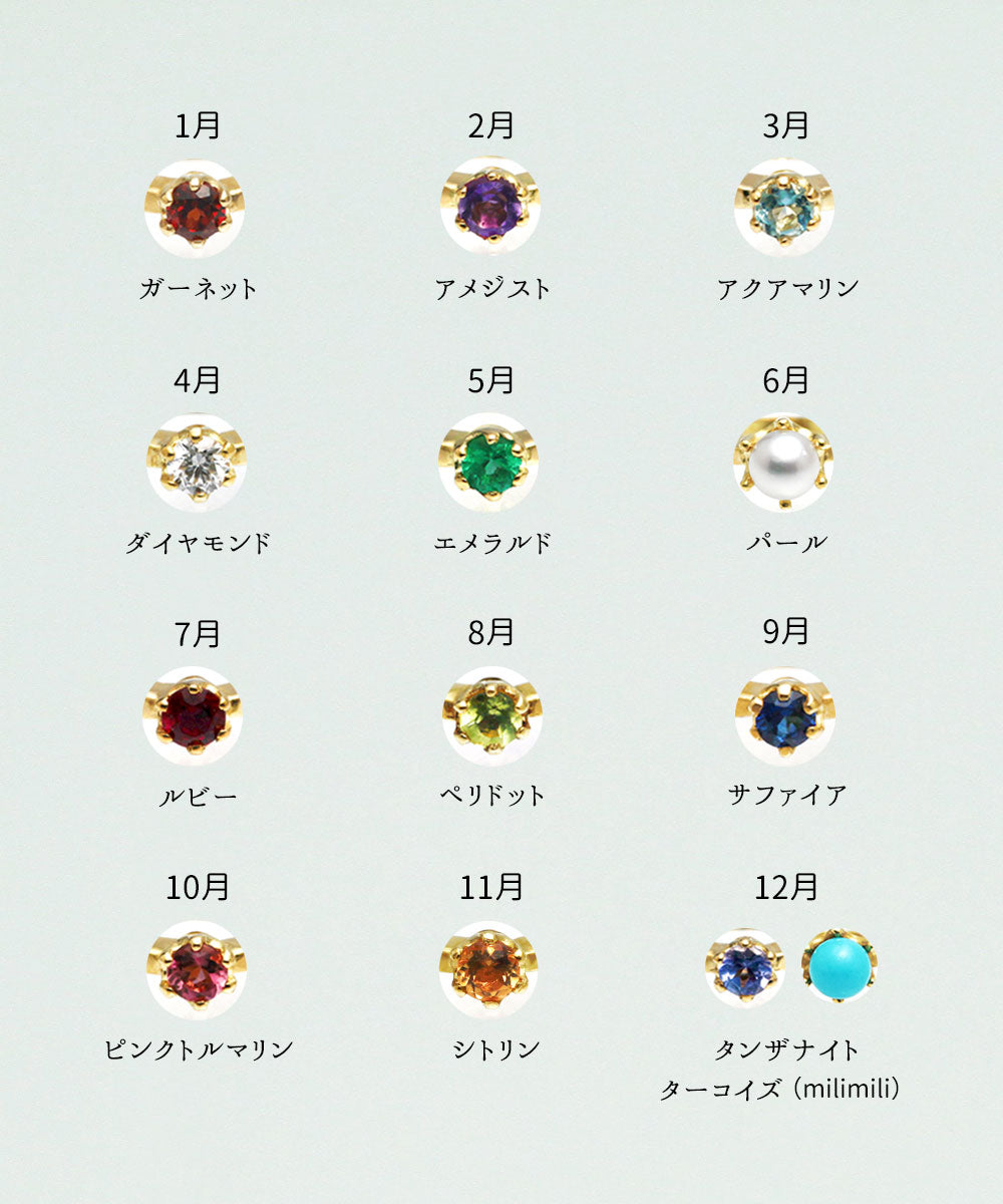 You can choose from the birthstones for each of the 12 months: January - Garnet, February - Amethyst, March - Aquamarine, April - Diamond, May - Emerald, June - Pearl, July - Ruby, August - Peridot, September - Sapphire, October - Pink Tourmaline, November - Citrine, and December - Tanzanite, Turquoise (milimili only).