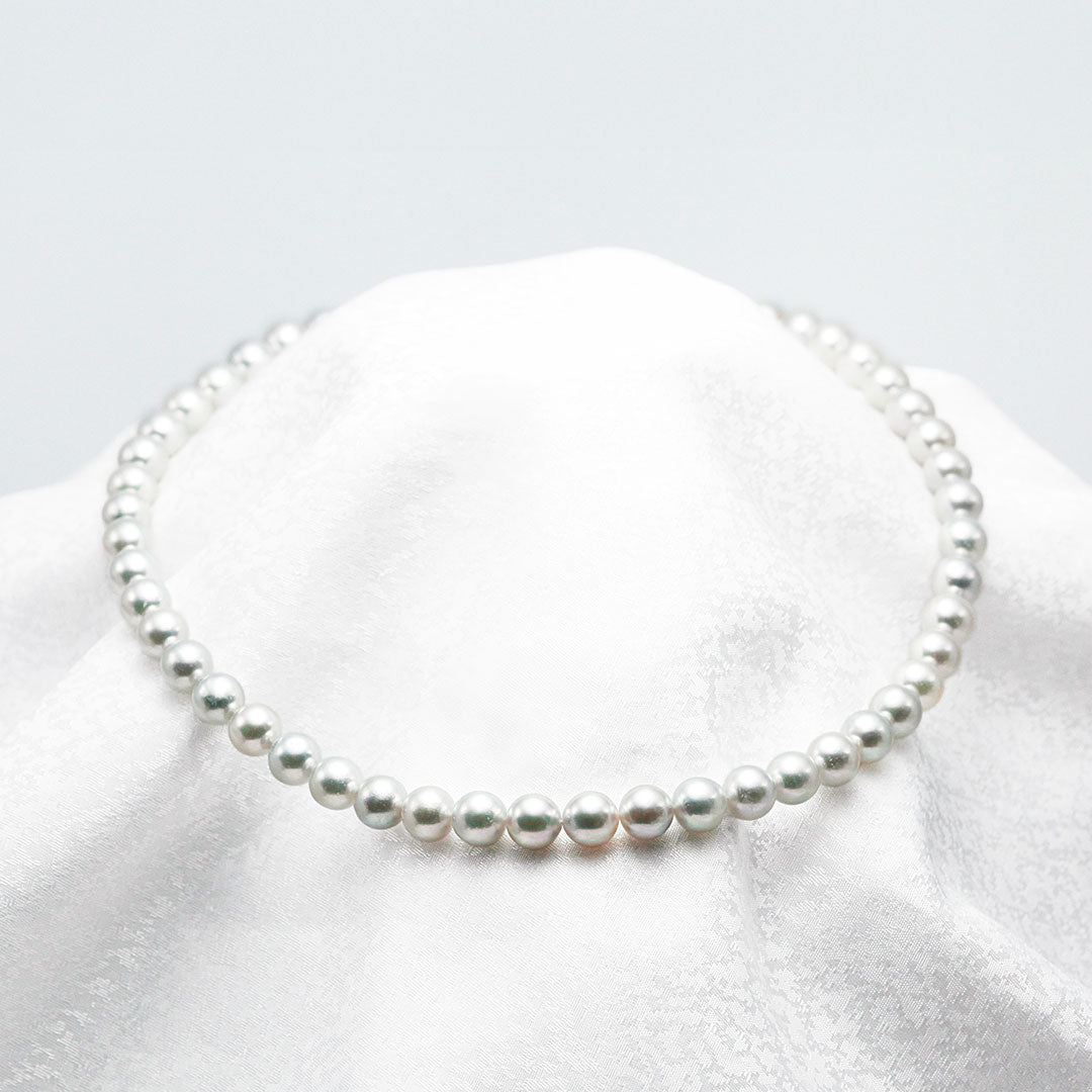 A single-strand necklace of blue-rose Akoya pearls. Featuring large 8.0–8.5mm Akoya pearls, this piece comes with a certificate from the Pearl Science Laboratory for your peace of mind. The greyish tone with a hint of blue and the strong luster give it an elegant and radiant appearance, perfect for a sophisticated woman. Each necklace is carefully hand-strung to match your preferred length.