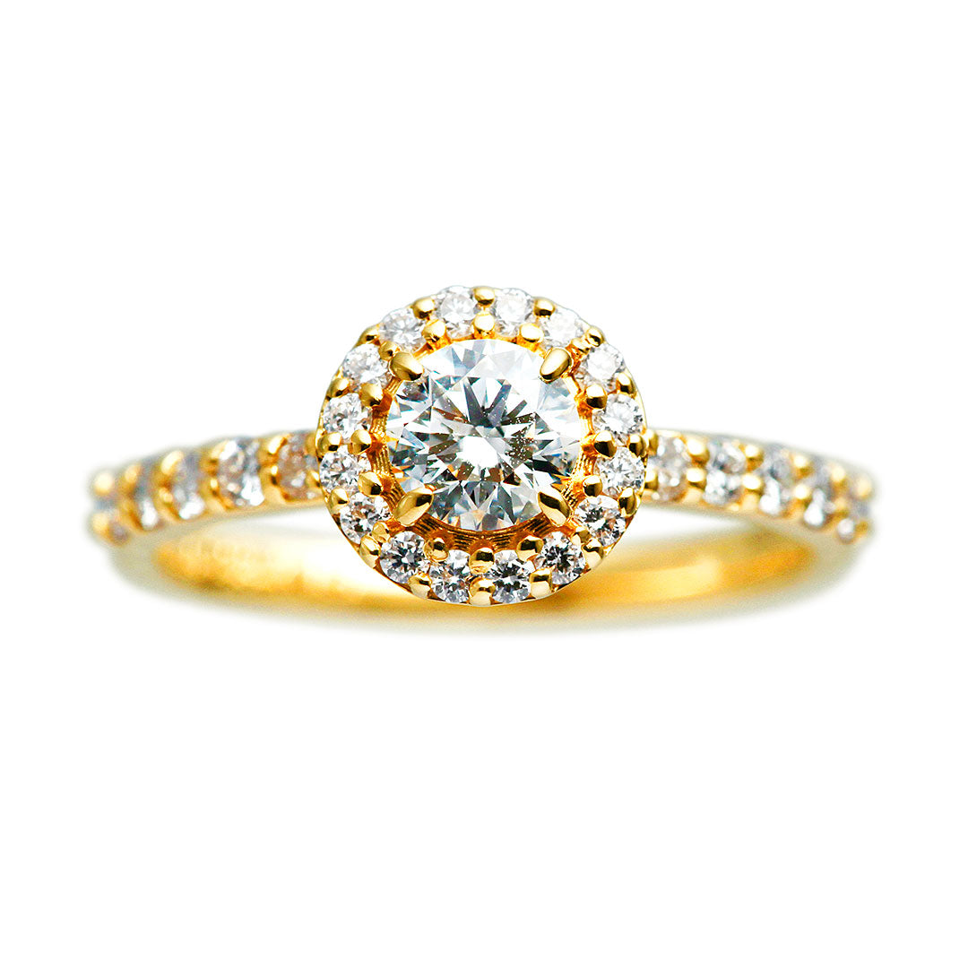 Diamond ring made of 18K yellow gold. The center has a 0.4ct heart and cupid (H&This ring features high-quality diamonds with a C cut. It features a halo design surrounded by diamonds and an eternity style with diamonds along the arms. Combining elegance and glamour, this timeless ring is sure to be a favorite for years to come.