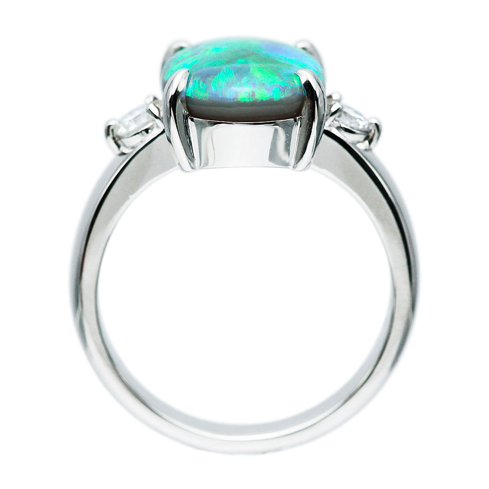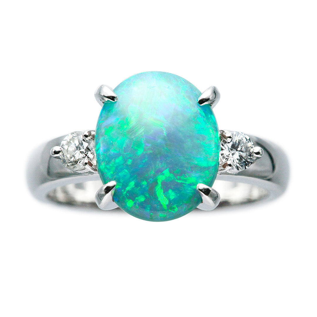 様々な色が溶け込んだオパールはどんな色味の服にもマッチします。和の装いにはもちろん、カジュアルだって大丈夫。その場合、ゴールドを使ってミル打ちなどが施されたアンティークな仕上げのものだと、気楽に普段着に合わせられます。大振りな石の場合は、プラチナ・ホワイトゴールドにダイヤの輝きをプラスして特別感を。少し柔らかい石なので、傷付けてしまうのが気になる方はネックレスがお勧めです。