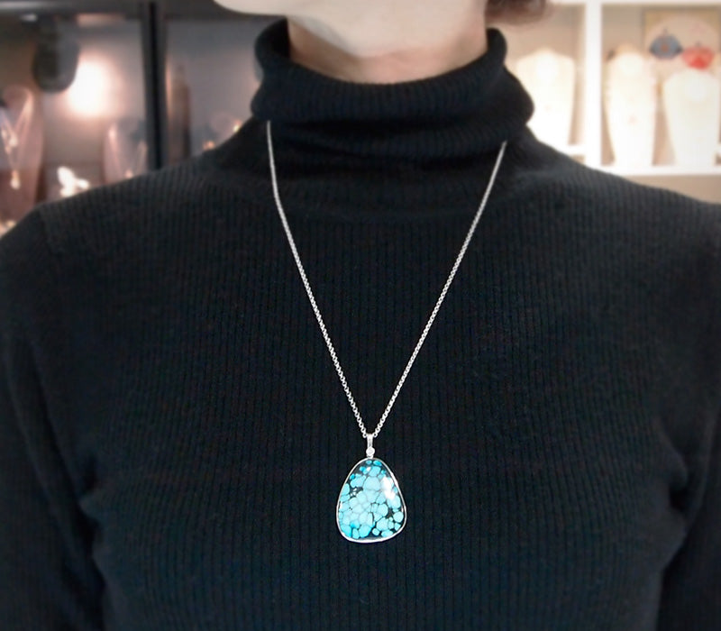 トルコ石特有のマット感のあるブルーの色合いは、カジュアルスタイルにぴったり。大振りで大胆なデザインを選んでみて下さい。プラチナ・ホワイトゴールドを使ったアイテムは白シャツやデニムとも相性が良く、真夏でも爽やか。そして冬には是非グレーに合わせて。地味になりがちな冬のコーディネートも、グッとおしゃれになりますよ。